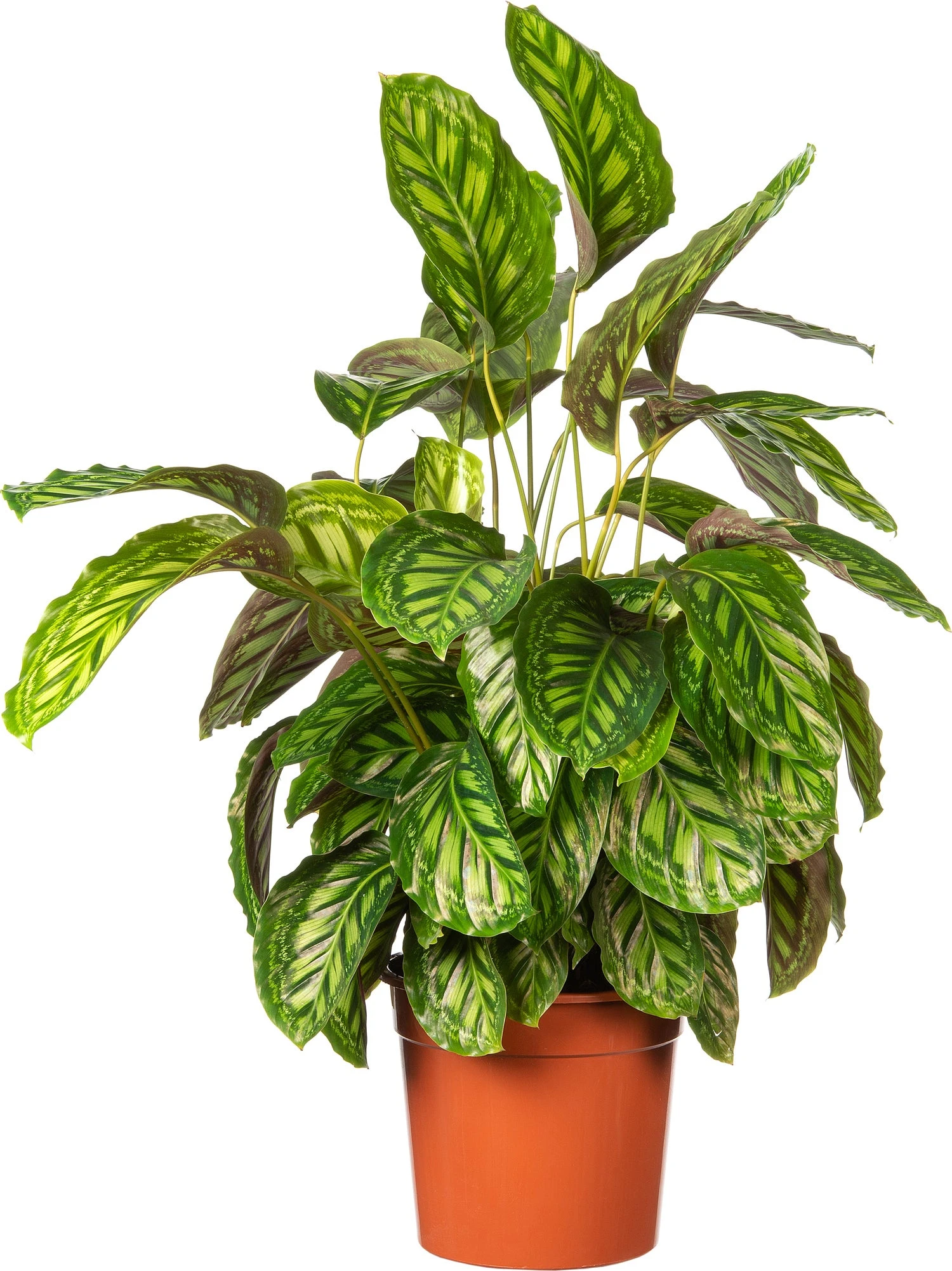 Wanneer deze plant het naar zijn zin heeft worden er nieuwe bladeren gevormd die sierlijk afrollen. De oude bladeren zullen geleidelijk geel of bruin worden en kunnen dan zo kort mogelijk worden afgeknipt. In het voorjaar en de zomer kan er maandelijks wat plantenvoeding in het gietwater gedaan worden. De plant kan niet goed tegen droogte, maar een iets donkerdere standplaats in huis wordt wel verdragen. Wanneer de pot vol zit met wortels en er bijna geen grond meer te zien is, heeft deze Calathea een grotere pot nodig. Neem hiervoor een pot die ongeveer 20 % groter is dan de bestaande pot en gebruik verse potgrond als aanvulling.