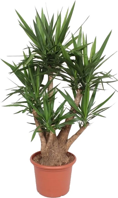 Ze hebben lange smalle bladeren en zijn te vinden met stam of zonder stam. In de natuur bloeien ze in prachtige trossen witte bloemen, in de huiskamer doen ze dit vaak niet. Bij ons is hij een prachtige stoere bladplant voor binnen die tegen een stootje kan. Een Yucca vormt blad aan de bovenkant van de stam. Hij heeft graag een lichte standplaats en vraagt niet veel water. De Yucca elephantipes kan in de natuur een boom worden van 10 meter hoog. Hij kan bloeien, maar zal dit meestal pas doen als hij wordt ‘verwaarloosd’. Uit nood zal hij dan gaan bloeien om te zorgen voor ‘nakomelingen’.